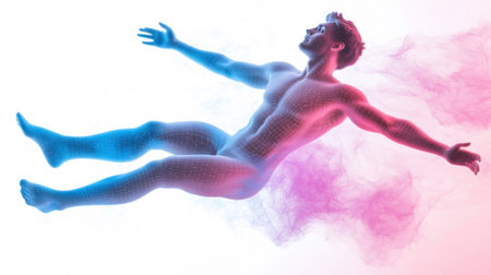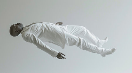 man lying comfortably in air, full body, pure white background