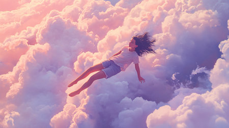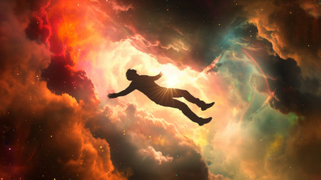 Surreal image of a boy floating peacefully in a vibrant, dreamlike cloudy sky