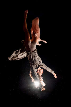 view of beautiful woman jumps at dark time and performs trick upside down