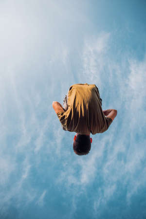 a man jumping over white clouds and blue sky. Challenge, risk, freedom and imagination concept
