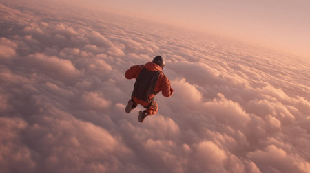 Experience the thrill of a skydiver in free fall surrounded by fluffy clouds during a breathtaking sunset. A perfect blend of adventure and natural beauty captures the essence of freedom.