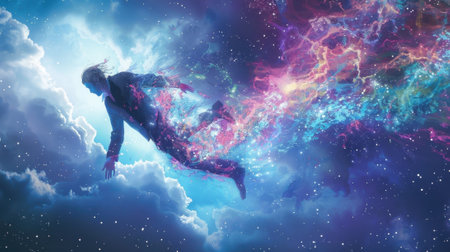 A surreal digital painting of a person floating in the universe, surrounded by cosmic energy, representing deep meditation and spiritual awakening.