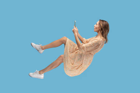 Hovering in air. Surprised shocked girl in dress levitating with mobile phone, chatting online in social network amazed by unbelievable news message, surfing web while flying. studio shot isolated