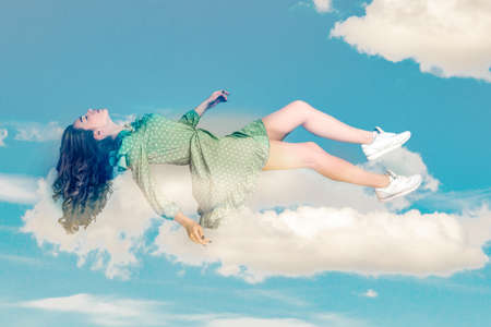 Floating in air. Relaxed girl in vintage ruffle dress levitating keeping eyes closed, sleeping while flying mid-air having comfortable peaceful dream in sky. collage composition on day cloudy blue sky