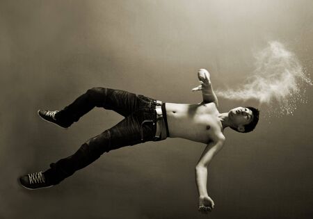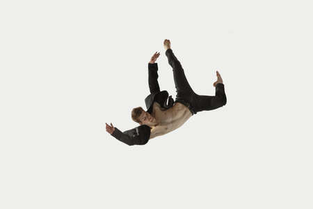Free falling. Mid-air shot of handsome young man falling against grey background
