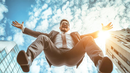 Happy businessman flying in the sky