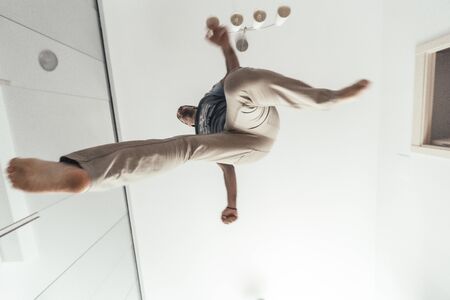 Handsome active young man dancing while jumping in the air