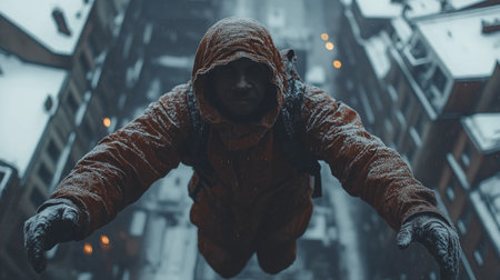 A businessman plunges through the air amidst tall skyscrapers, his figure captured in striking motion blur against a city backdrop.