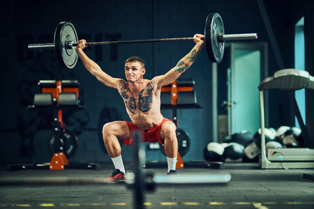Man at the gym. Execute exercise squatting with weight, in gym