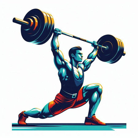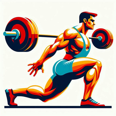 Powerful weightlifter poised for a clean and jerk surrounded by fiery energy