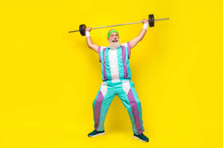 Full size photo of handsome sportive granddad hold raise barbell up isolated on yellow color background