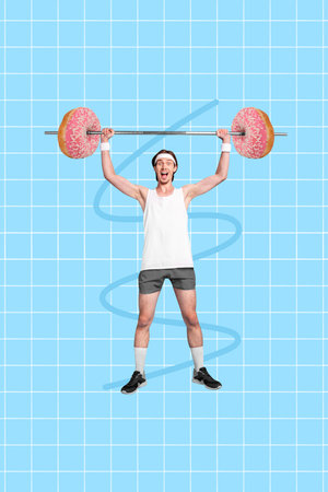 Collage photo of young powerlifting guy wear sportswear raise hands heavy dumbbell glazed donuts junk food isolated on plaid blue background