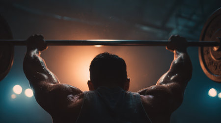 A dedicated athlete lifting a heavy barbell in a dimly-lit gym early in the morning during a strength training session. Generative AI