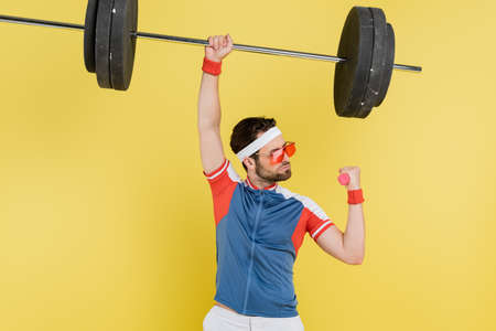 Sportsman lifting barbell and dumbbell isolated on yellow