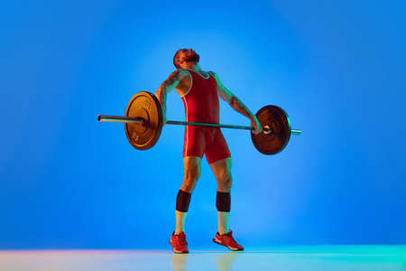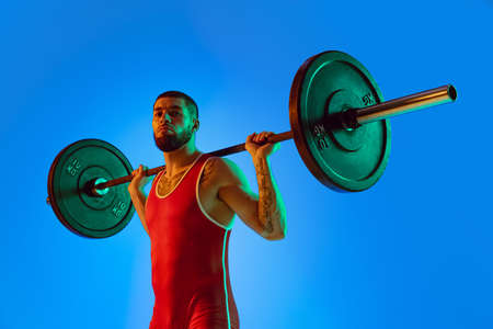 Studio shot of young man in red sportswear exercising with barbell isolated blue background in neon. Sport, weightlifting, power, achievements concept
