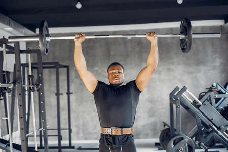 Athletic black man lifting a barbell in the gym