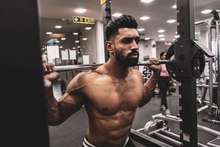 A well-trained athlete trains his leg muscles at a training center. barbell squats in the gym.