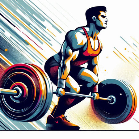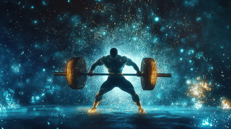 A weightlifter stands confidently with a heavy barbell, showing immense strength amid a vibrant backdrop of colorful sparks and glowing lights, representing energy and determination.