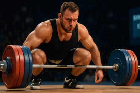 A muscular athlete lifting barbell in gym, intense lighting, fitness motivation, strength focus