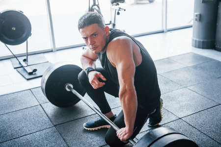 Strong young man in sportive clothes doing exercises with heavy weights in the gym.