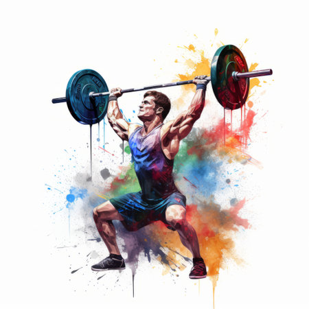 fitness man with a barbell in watercolor print, showcasing a vibrant explosion of colors. this artwork, created by a talented artist, combines traditional techniques with a realistic portrayal of light and color. the high-resolution print captures the intricate details, while the heavy use of palette knives adds texture. a bronze casting adds a touch of elegance to this dynamic piece. ai generated