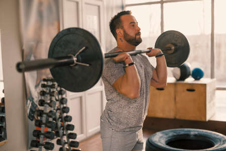 Young fit male sportsman doing squats with a barbell over his shoulders in gym.
