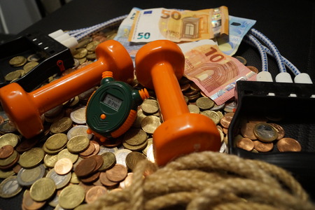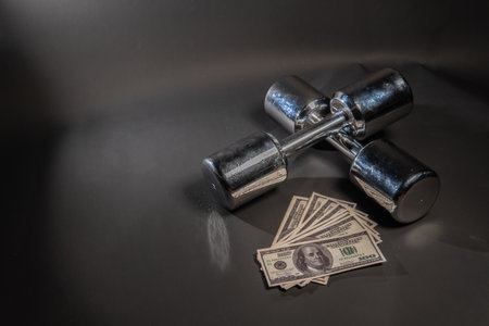 one hundred dollars and dumbbells on a blue background. red dumbbells and money