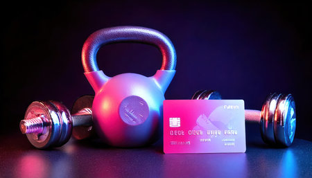Fitness equipment with credit card and kettlebell on black background.