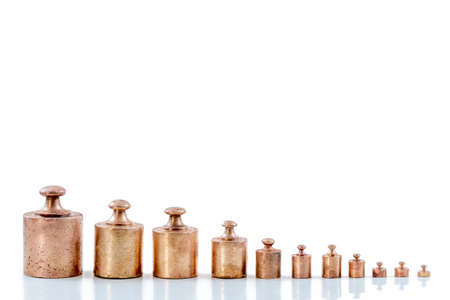 Set of precision weights for a balance scale isolated on white background by descending order