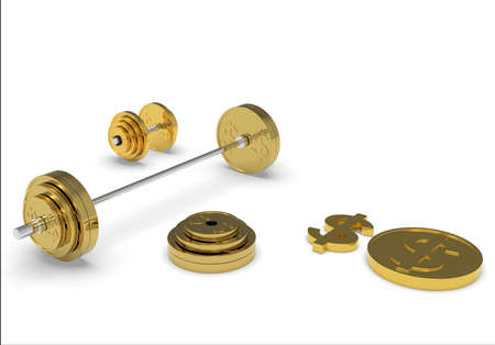 Gold barbell dumbbell and a coin with a dollar sign 3d-rendering