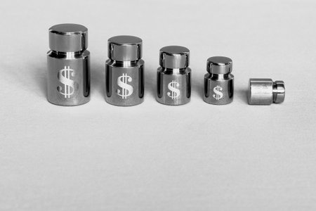 A diagram of the decline in the exchange rate in the form of metal weights with the symbolism of the dollar. The concept of reducing the weight of the dollar in the global economy. black and white.