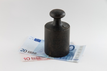 Financial concept Old rusty weight on money and diagrams
