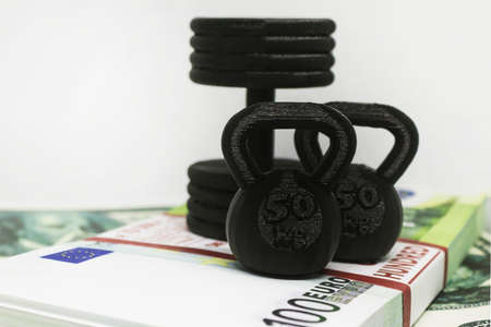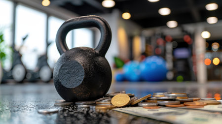 A black kettlebell rests on a gym floor surrounded by a mix of cash and coins, symbolizing the financial investment in health and fitness lifestyles.