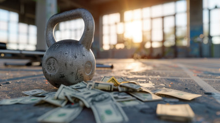 A captivating scene showcasing a kettlebell beside scattered dollar bills on the gym floor, illuminated by sunset, symbolizing the connection between fitness and financial success.