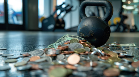 A black kettlebell rests on a gym floor surrounded by coins and cash, symbolizing the intersection of fitness and financial investment in a modern studio.
