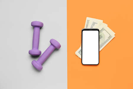 Dumbbells with money and mobile phone on color background. Concept of balance