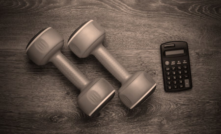 Fitness, sport concept. Calorie Counting. Calculator and dumbbell on wooden floor. Top view