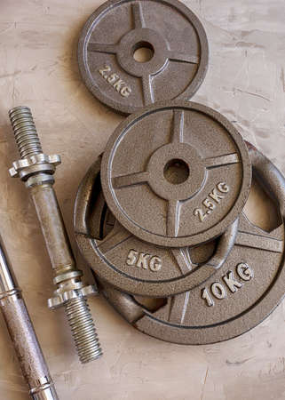 Weight plates for barbell or dumbbells in cement floor in gym. Accessories for weight training and building muscle. Sport or workout concept background.
