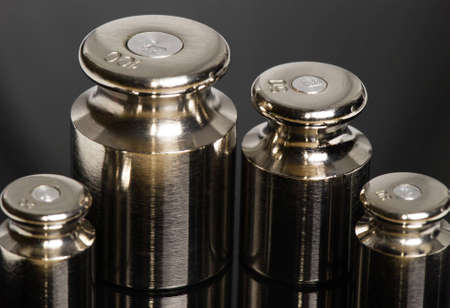 Metal weights for measuring weight. Standard for weighing goods. Dark background.