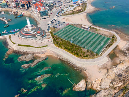 Aerial photography of the football field on the islands and reefs of Qingdao coastline