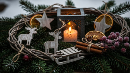Lantern and christmas decoration on snow and garland lights background