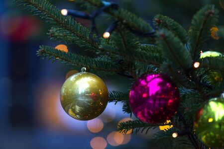 Close up branch of christmas tree with colorful balls and toys. New Year background. Winter backdrop