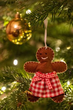 A fabric gingerbread man woman bear shaped Christmas Tree Decoration hanging from a tree