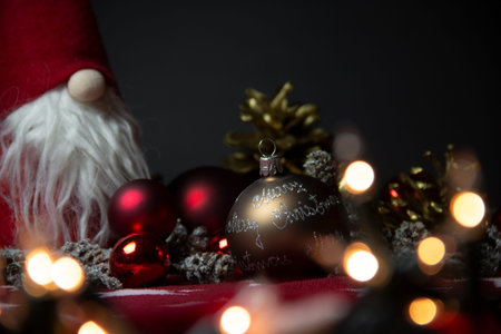 Santa Claus toy with christmas ornaments on bokeh background
