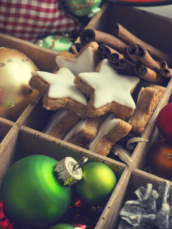 Colorful Christmas decoration items in a wooden box, close up shot