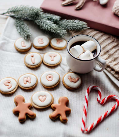 Hot cocoa with marshmallows and gingerbread cookies in female hands