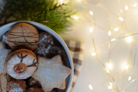 White porcelain bowl with Christmas cookies on a white background, fairy lights and fir tree in the picture, top view, horizontal