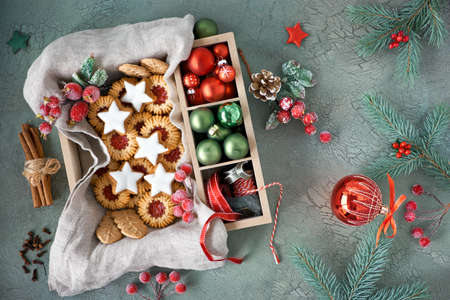 Flat lay with Christmas cookies and seasonal decorations in wooden box on gray rustic background with fir twigs and cinnamon sticks