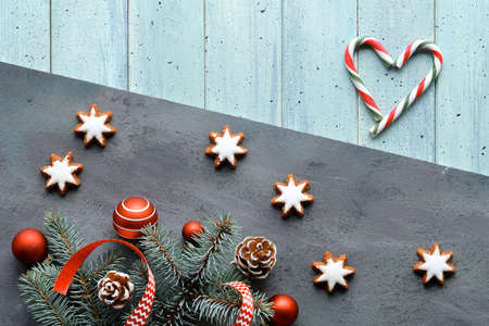 Zero Waste Christmas background. Xmas flat lay with heart from stripy candy canes. Fir twigs, ribbons, cones, star cookies and red balls. Dark light split wooden background. Happy New Year