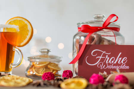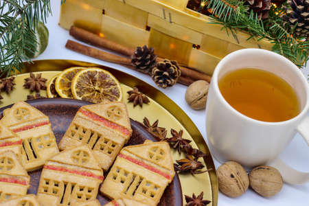 Christmas eve. Cookies in shape of houses and white cup of tea